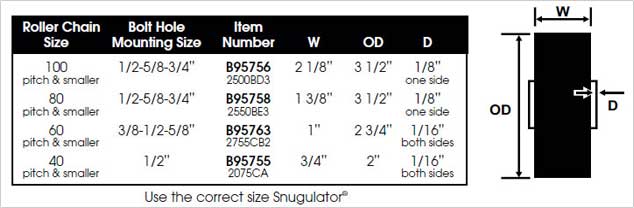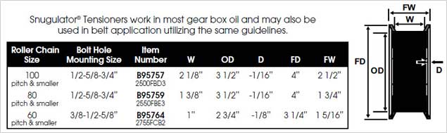 Perfect for belts and roller chains with short runs where a bolt can be used as a mounting device. Choose a tensioner that will protrude a minimum 1/8" beyond each side of the chain.